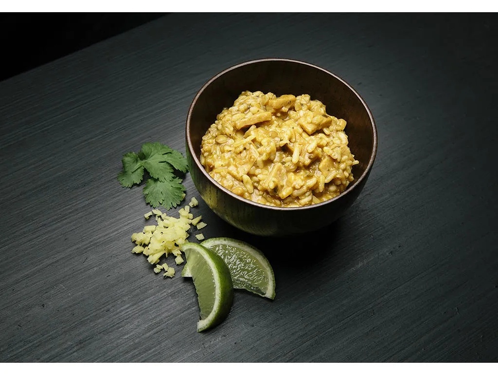 ryža, kuracie mäso, šošovica, cibuľa, kokosové mlieko, kyslá smotana, kukuričná múka, paradajkové pyré, repkový olej, špenát, kurací vývar, sójová omáčka, zázvor, cesnak, soľ, korenie, rozmarínový extrakt