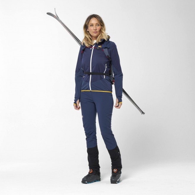 Dámske skialpinistické nohavice na rýchle výšľapy v horách alebo zimnú turistiku. Kombinujú rôzne materiály pre optimálnu ochranu pred počasím, odolnosť a voľnosť pohybu. Silnejší softshellový materiál je vetruvzdorný, priedušný, oderuvzdorný a elastický, takže neobmedzuje v pohybe, a vďaka DWR úprave odolá aj slabšiemu dažďu. Majú tvarované kolená a klin v rozkroku. Pás prispôsobiteľný gumičkou, a spodok nohavíc rozzipsovateľný. Nohavica je spevnená odolným materiálom hardtex™, ktorý zabráni roztrhnutiu o klipsňu alebo mačku.