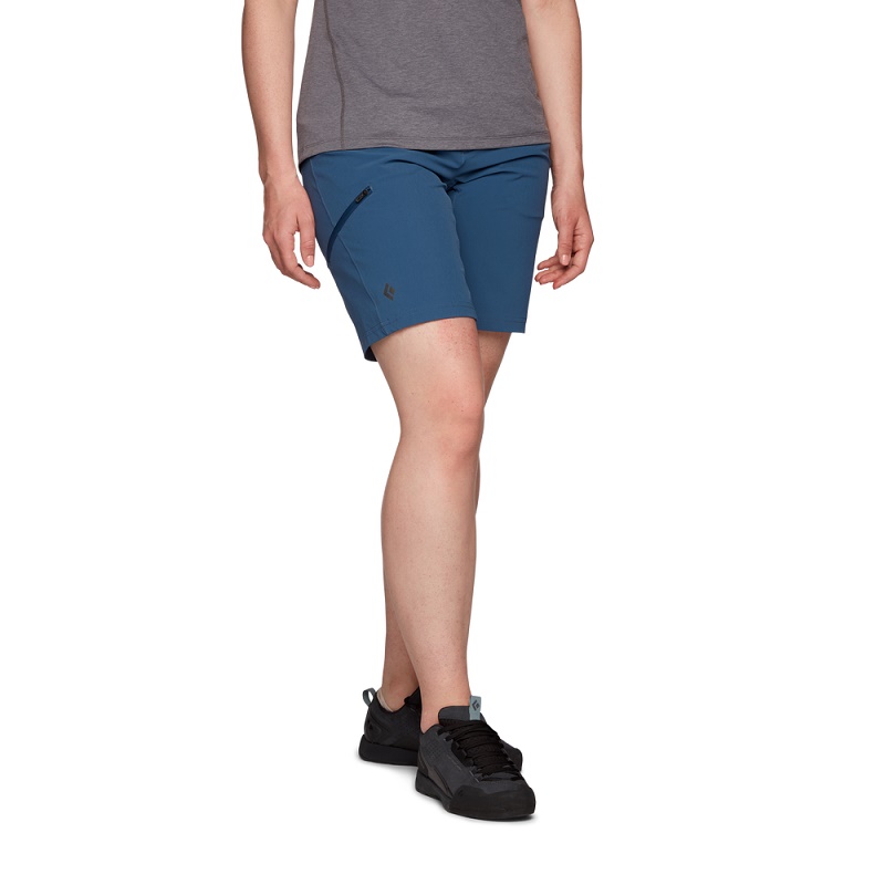 Ľahké dámske turistické aj lezecké šortky Black Diamond VALLEY. Ponúkajú dokonalé prispôsobenie ženskej postave vďaka strečovému materiálu. Obsahujú klinové výstuhy špecifické pre lezenie, stehenné vrecko na zips na uloženie základných vecí a dve predné vrecká.