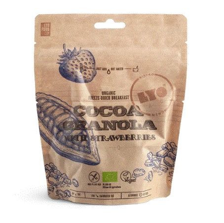 Kakaová granola s jahodami je dehydrované bio jedlo od výrobcu Lyo Food. Vďaka svojej nízkej hmotnosti je jedlo ideálne pre výpravy do prírody, treky, výlety či do kempu, kde oceníte každý ušetrený gram hmotnosti, ktorú musíte priniesť. Kakaová granola s 270 gramovou porciou jedla je ľahká a chutná, ovsená granola s kakaom a jahodami, sladená agávovým sirupom.