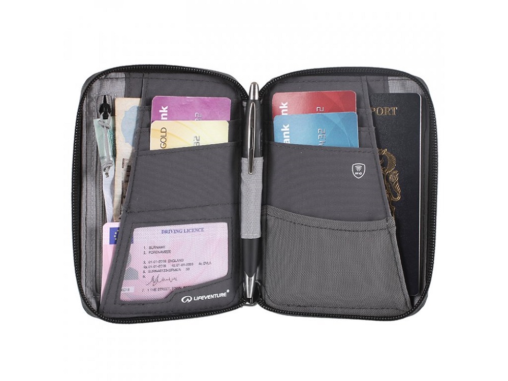 Cestovná peňaženka RFiD Mini Travel Wallet od výrobcu Lifeventure je kompaktný a šikovný spoločník na cesty. Ideálna na uloženie všetkých vašich cestovných dokumentov na jednom organizovanom mieste.  Peňaženka obsahuje 7 vreciek na karty, skryté vrecko na smartfón a pas, vrecko na zasunutie palubného lístka leteckej spoločnosti a 3 ďalšie vrecká na bankovky či lístky. K dispozícii je tiež vnútorné vrecko na zips a praktické pútko na pero. Táto cestovná peňaženka chráni obsah pred čítačkami rádiofrekvenčnej identifikácie (RFiD) zastavením prenosu informácií cez niklovú a medenú polyesterovú tkaninu, čím sa znižuje riziko krádeže identity.