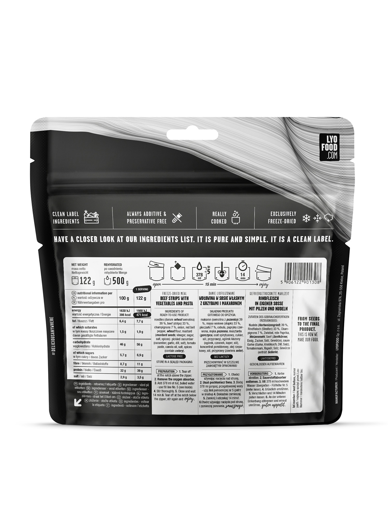 Jemné hovädzie kúsky dusené s cibuľou, šampiňónmi a kyslou uhorkou, ochutené horčicou a rôznymi koreninami. Podávame s penne cestovinami. Vychutnajte si tento klasický recept aj keď ste v prírode. Pokrmy sú pred sušením zmrazené a ochutené. Neobsahujú žiadne umelé prísady, žiadne pridané cukry, palmový olej ani konzervačné látky. Jedlo je vyrobené zo 100 % prírodných surovín. Trvanlivosť je 5 rokov. BEZ LAKTÓZY.
