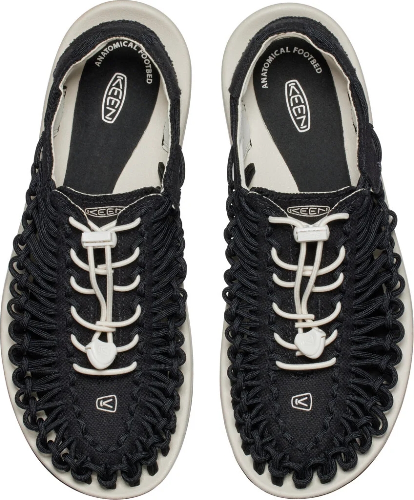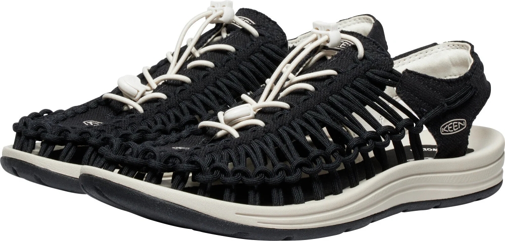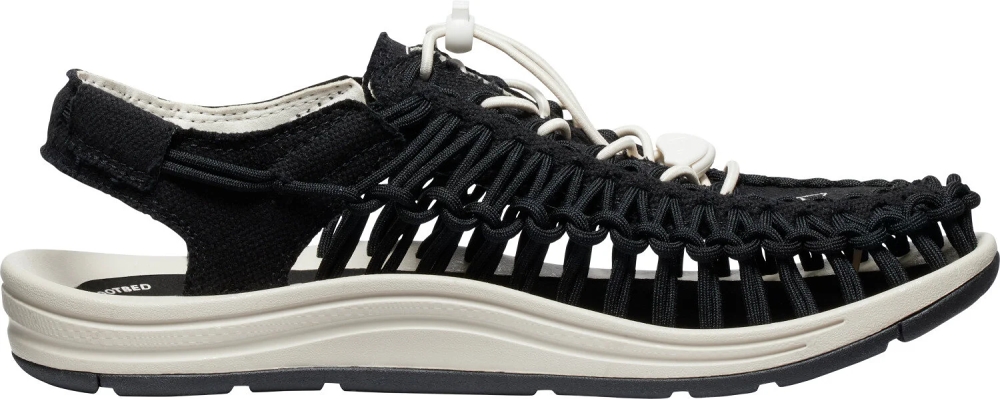 Inovovaná, originálne riešená letná topánka Keen Uneek Canvas, ktorú využijete v meste, v menej náročnom teréne aj vo vodnom prostredí. Jedinečnú konštrukciu modelu tvorí ľahký zvršok spletený z dvoch pevných plátených šnúrok, rýchloschnúca podšívka a podošva. Topánka sa sťahuje pomocou pružnej šnúrky s brzdičkou z recyklovaného PET materiálu. Stielka aj medzipodrážka sú z polyuretánu, ktorý poskytuje podporu klenbe chodidla a príjemne tlmí došľap. Podošva z kvalitnej gumy je vybavená viacsmerným vzorom s jemnými lamelami pre lepšiu stabilitu na mokrom povrchu. Mikroplesne a zápach vo vnútri topánky obmedzuje technológia ECO ODOR CONTROL šetrná k životnému prostrediu.