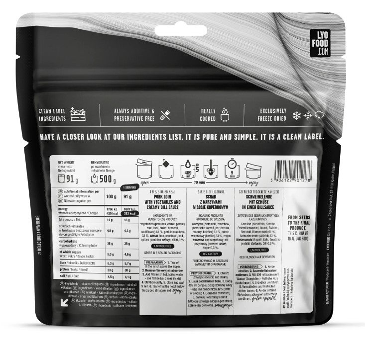 Bravčová panenka so zemiakmi v krémovej kôprovej omáčke. Toto delikátne jedlo vás vráti späť do vášho detstva. Jedlá sú pred vysušením mrazom varené a ochutené.
