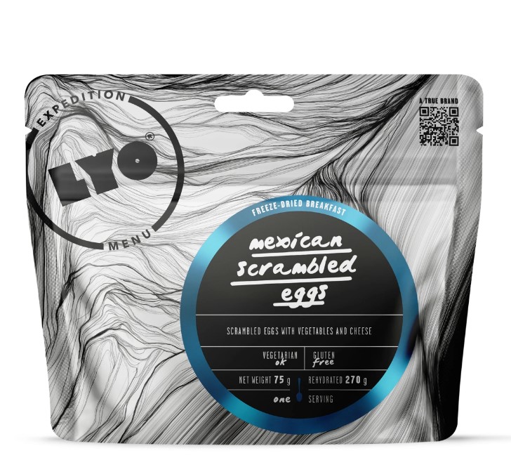 Miešané vajcia na mexický spôsob sú výživné expedičné turistické raňajky od značky Lyofood zo 100% prírodných surovín. Jedlo je vegetariánske, bezlepkové a neobsahuje žiadne umelé prísady, žiadny extra cukor, žiadny palmový olej ani konzervačné látky.