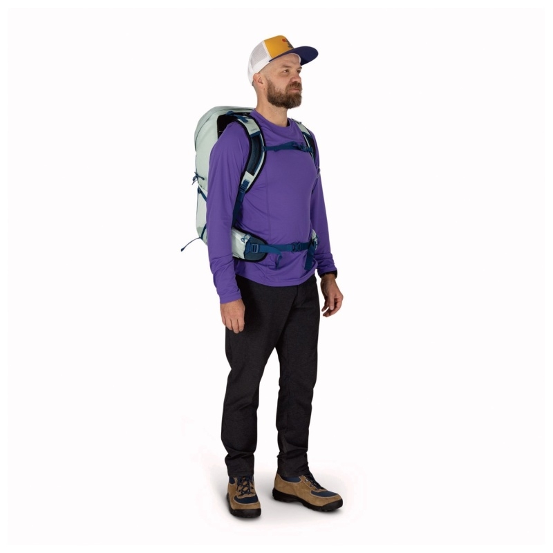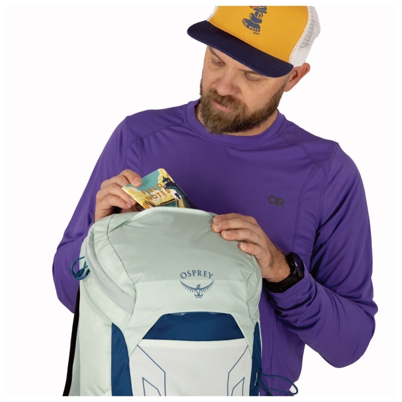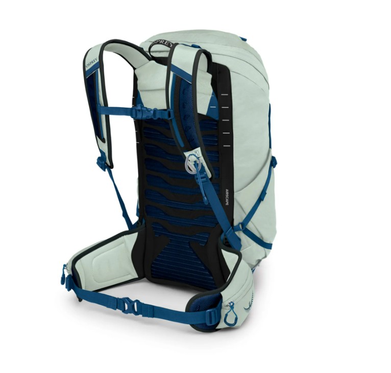 Má jednu hlavnú priehradku. Prístup do nej je možný z hornej časti. Priehradka je zabezpečená zipsom. Vo vnútri hlavnej komory sa nachádza sieťované vrecko. Batoh má vyhradený priestor na hydratačný systém. Na prednom paneli nájdete elastické sieťované vrecko na špinavé alebo mokré oblečenie. Ďalšie dve elastické vrecká nájdete na bokoch. Tento model je vybavený aj vreckami na bedrovom páse. Ich mäkké polstrovanie dobre ochráni vaše okuliare pred poškriabaním. Batoh má aj jednotlivé pútka na nosenie cepínu a bočné kompresné popruhy. Pre značku Osprey je charakteristický systém nosenia trekingových palíc s názvom Stow-on-the-Go™. Umožňuje ich pohodlné pripevnenie na jeden z ramenných popruhov, takže k nim budete mať vždy ľahký a rýchly prístup.