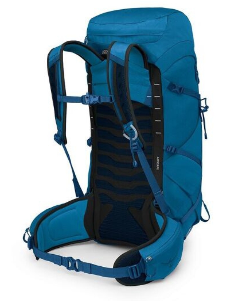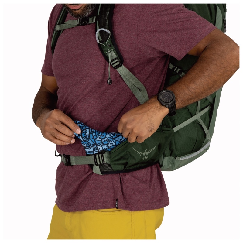 Má jednu hlavnú priehradku a prístup k nej z hornej časti. Hlavná priehradka je zaistená chlopňou upevnenou dvoma prackami. Nachádza sa na nej vonkajšie vrecko na zips a vnútorné vrecko zo sieťoviny. Batoh má vyhradený priestor pre hydratačný systém. Na prednom paneli nájdete elastické sieťované vrecko na špinavé alebo mokré oblečenie. Ďalšie dve elastické vrecká sa nachádzajú na bokoch. Tento model má aj vrecká na bedrovom páse – ich mäkké polstrovanie dobre ochráni vaše okuliare pred poškriabaním. Batoh Osprey má tiež pútka na cepín a bočné kompresné popruhy. Pre značku Osprey je charakteristický inovatívny systém nosenia trekingových palíc s názvom Stow-on-the-Go™. Vďaka tomu ich môžete pohodlne pripevniť na jeden z ramenných popruhov, takže k nim budete mať vždy ľahký a rýchly prístup.
