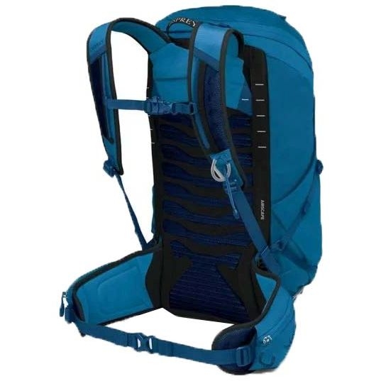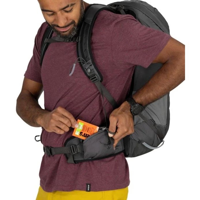 Má jednu hlavnú priehradku. Prístup do nej je možný z hornej časti. Priehradka je zabezpečená zipsom. Vo vnútri hlavnej komory sa nachádza sieťované vrecko. Batoh má vyhradený priestor na hydratačný systém. Na prednom paneli nájdete elastické sieťované vrecko na špinavé alebo mokré oblečenie. Ďalšie dve elastické vrecká nájdete na bokoch. Tento model je vybavený aj vreckami na bedrovom páse. Ich mäkké polstrovanie dobre ochráni vaše okuliare pred poškriabaním. Batoh má aj jednotlivé pútka na nosenie cepínu a bočné kompresné popruhy. Pre značku Osprey je charakteristický systém nosenia trekingových palíc s názvom Stow-on-the-Go™. Umožňuje ich pohodlné pripevnenie na jeden z ramenných popruhov, takže k nim budete mať vždy ľahký a rýchly prístup.