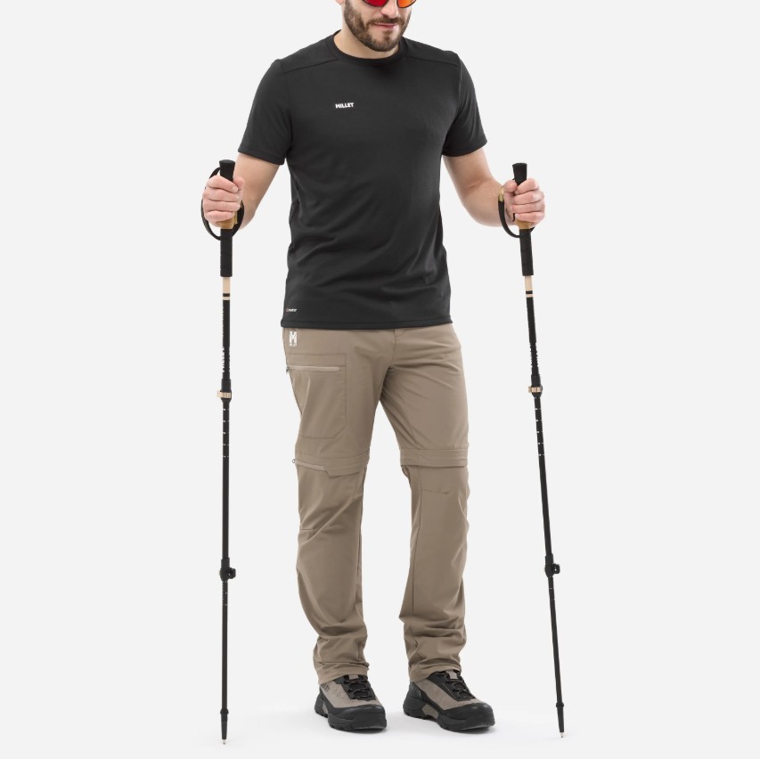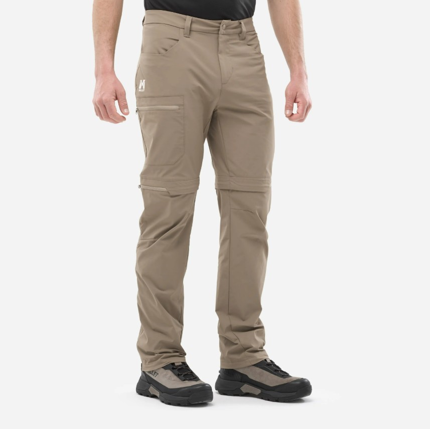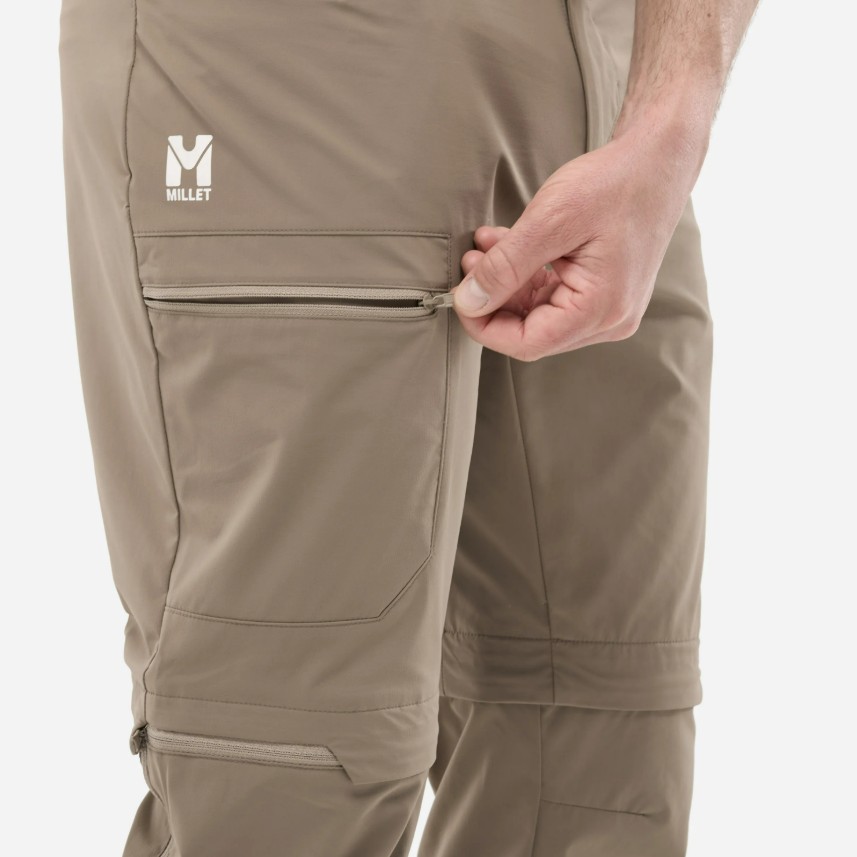 Pánske odzipsovateľné turistické nohavice Millet na všetky letné outdoorové aktivity. Vďaka pozdĺžnemu zipsu z nich za pár sekúnd spravíš šortky bez potreby vyzúvania topánok. Nohavice sú priedušné a veľmi pohodlné vďaka prepracovanému strihu, tvarovaným kolenám a vysoko strečovej tkanine. Materiál má vodeodolnú úpravu, ktorá ťa ochráni pred ľahkým dažďom.