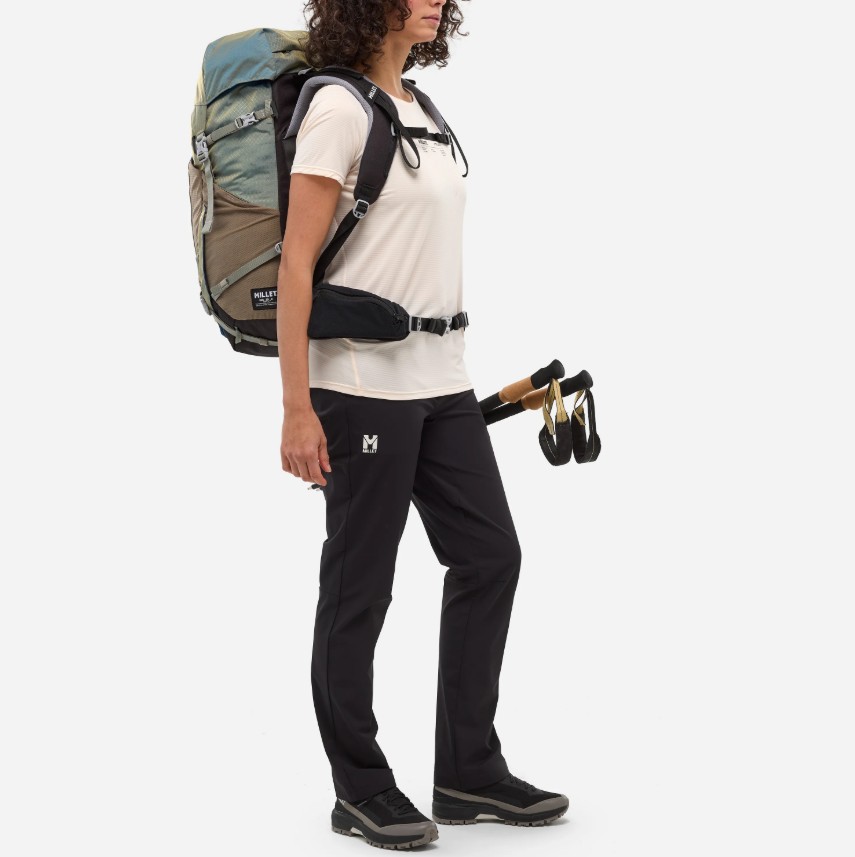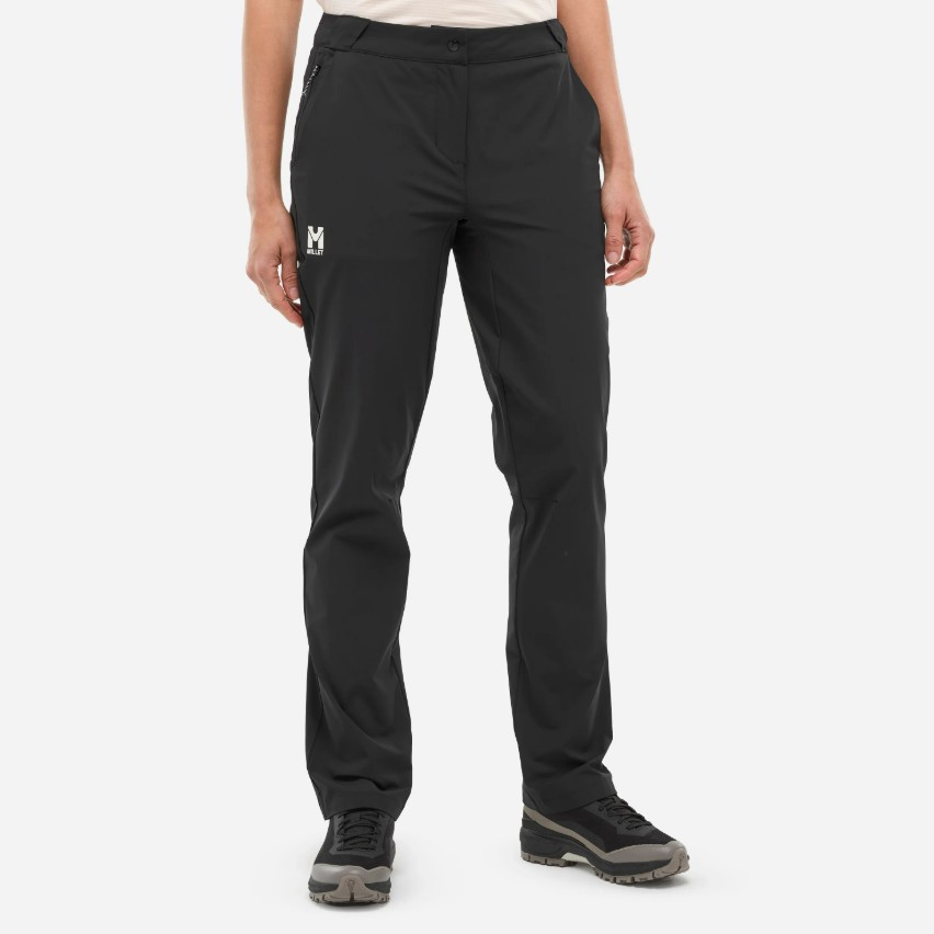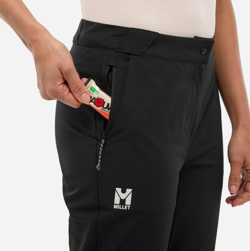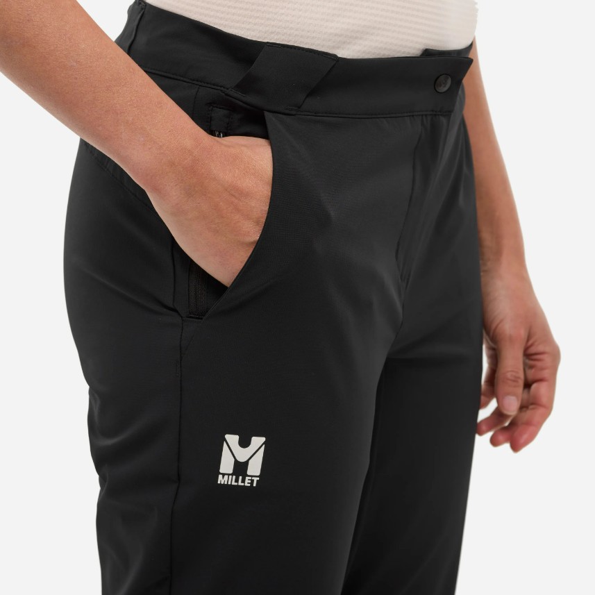 Dámske turistické nohavice Millet na všetky letné outdoorové aktivity. Nohavice sú priedušné a veľmi pohodlné vďaka prepracovanému strihu, tvarovaným kolenám a vysoko strečovej tkanine. Materiál má vodeodolnú úpravu, ktorá ťa ochráni pred ľahkým dažďom.