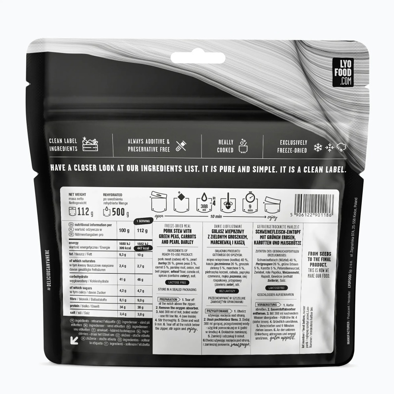 Expedičná strava Lyofood DUSENE BRAVČOVÉ S KRÚPAMI. Je ľahké užívať si vonkajšie zážitky s lahodným jedlom v batohu. LYO Dusené bravčové s krúpami je dobre vyvážený pokrm vytvorený tak, aby vám dodal veľa potrebnej energie na posledný úsek akéhokoľvek dobrodružstva. Predstavte si jemné kúsky bravčového mäsa a krúpy namočené v smotanovej omáčke so štedrou porciou zeleniny, vrátane mrkvy, červenej papriky, zeleného hrášku, koreňového petržlenu a cibule. Jedlo nabité sacharidmi a bielkovinami je presne to perfektné palivo pre to, čo na vás čaká hneď za rohom.