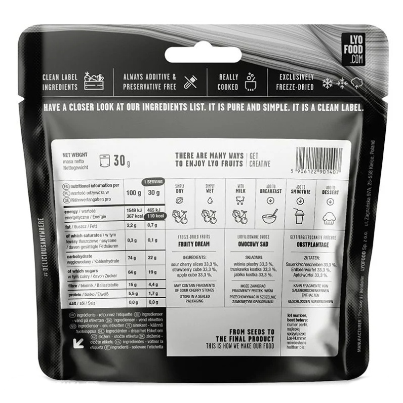 Lyofood FRUIT DREAM, dehydrované jedlo. Višne, jablko a jahody… olovrant, na ktorý si vždy nájdete čas aj uprostred diania vysoko nad mrakmi. Ovocný mix LYO Fruit dream môžete jesť len tak alebo ho pridajte do rannej kaše, ktorú tak premeníte na neobvyklý ovocný zážitok. Nech už si vyberiete čokoľvek, jedno je isté: vybaví vás to pozitívnou energiou na zvyšok vášho dňa.