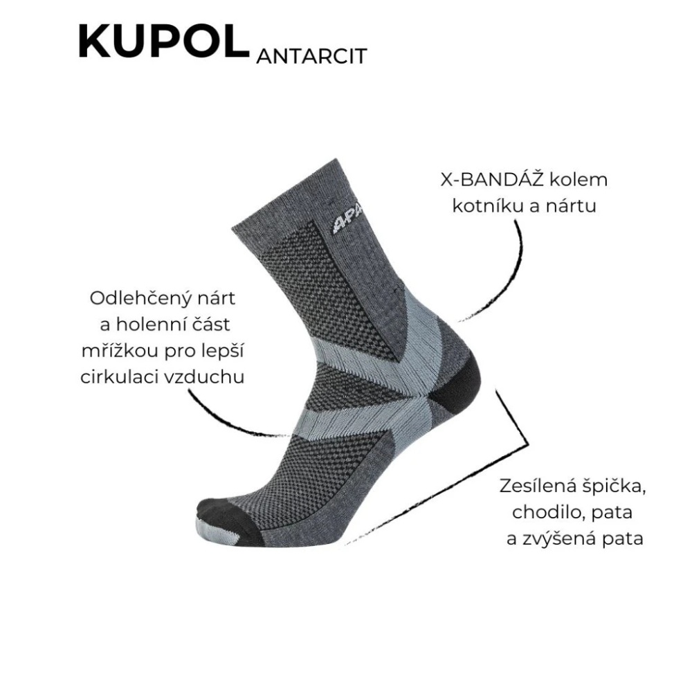 Športové celoročné bavlnené ponožky SherpaX KUPOL klasickej dĺžky. Pre lepšiu cirkuláciu vzduchu majú odľahčený priehlavok a holennú časť mriežkou. Ponožky KUPOL majú X-BANDÁŽ okolo členku a priehlavku, zosilnenú špičku, chodidlo, zvýšenú a zosilnenú pätu. Môžeš si ich vziať napríklad na turistiku, na beh, na cyklistiku, na sálové športy, na futbal.