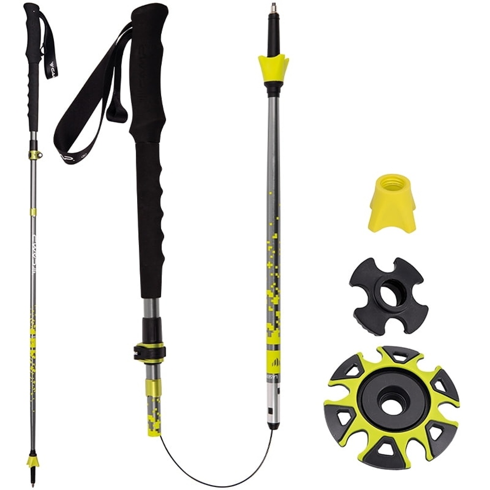 Mäkké nízkoprofilové pútka na zápästie zvyšujú pohodlie pri dlhšom používaní a karbidové hroty zabezpečia istý záber na tvrdom, kamenistom aj premenlivom podklade. Súčasťou balenia sú gumové krytky hrotov a niekoľko veľkostí tanierikov na použitie počas rôznych ročných období. C.A.M.P. Laser ADJ sú univerzálne skladacie palice, ktoré ponúknu ľahkosť, kompaktný rozmer a istotu pri pohybe v horách aj na chodníku.