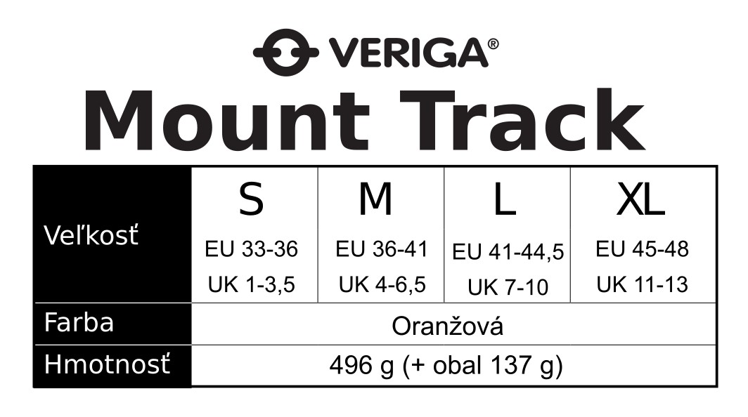 Elastické mačky Veriga Mount Track majú na podrážke reťaze z nerezovej ocele s 13. hrotmi v tvare podkovy, vyrobených výhradne z ušľachtilej ocele, ktoré zaisťujú efektívnu priľnavosť. Jednoducho ich natiahnite cez obuv a utiahnite ich popruhom.